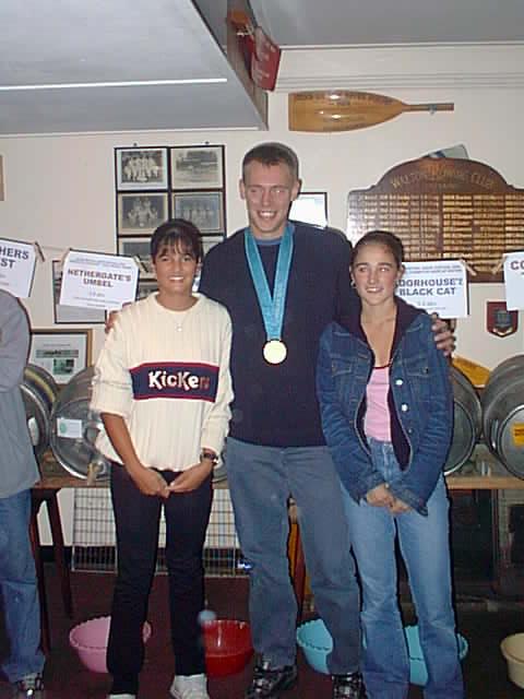 Yeah I didn't know it either until Nick De Cata told me one day in the rowing club bar. What rhymes with spod?.......squad, how clever I wonder who thought that up. Slowly more and more juniors were let on to the squad, and now it is what you see today, a fine body of young men and women rowing in style. RIGHT: Nicola (aka fox) and me in the very bar where it all started. In the middle, Steve Trapmore, Olympic Gold medal winner, and he used to row at our club.